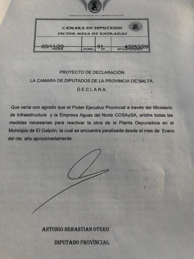 El Galpón: El Diputado Otero solicitó la reactivación de la obra Planta Depuradora en el municipio